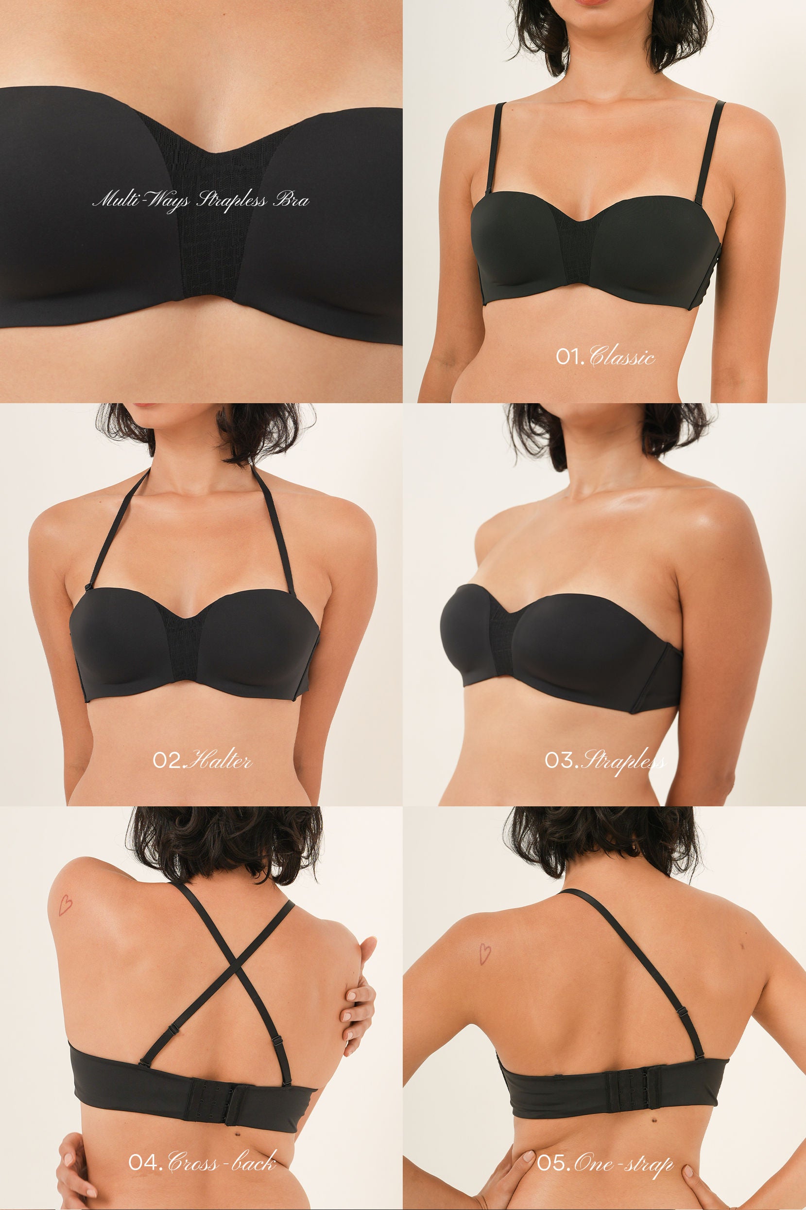 • 5 cara pemakaian: klasik, halter, crossback, satu tali atau tanpa tali.